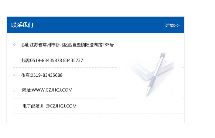 地址:常州市新北區友邦商務大廈1幢16、17層  電話:0519-85101652  傳真:0519-85112595  郵編:213022  網址:www.cz-jiayue_cn.ftb688.com  郵箱:xiajifengaa@163.com